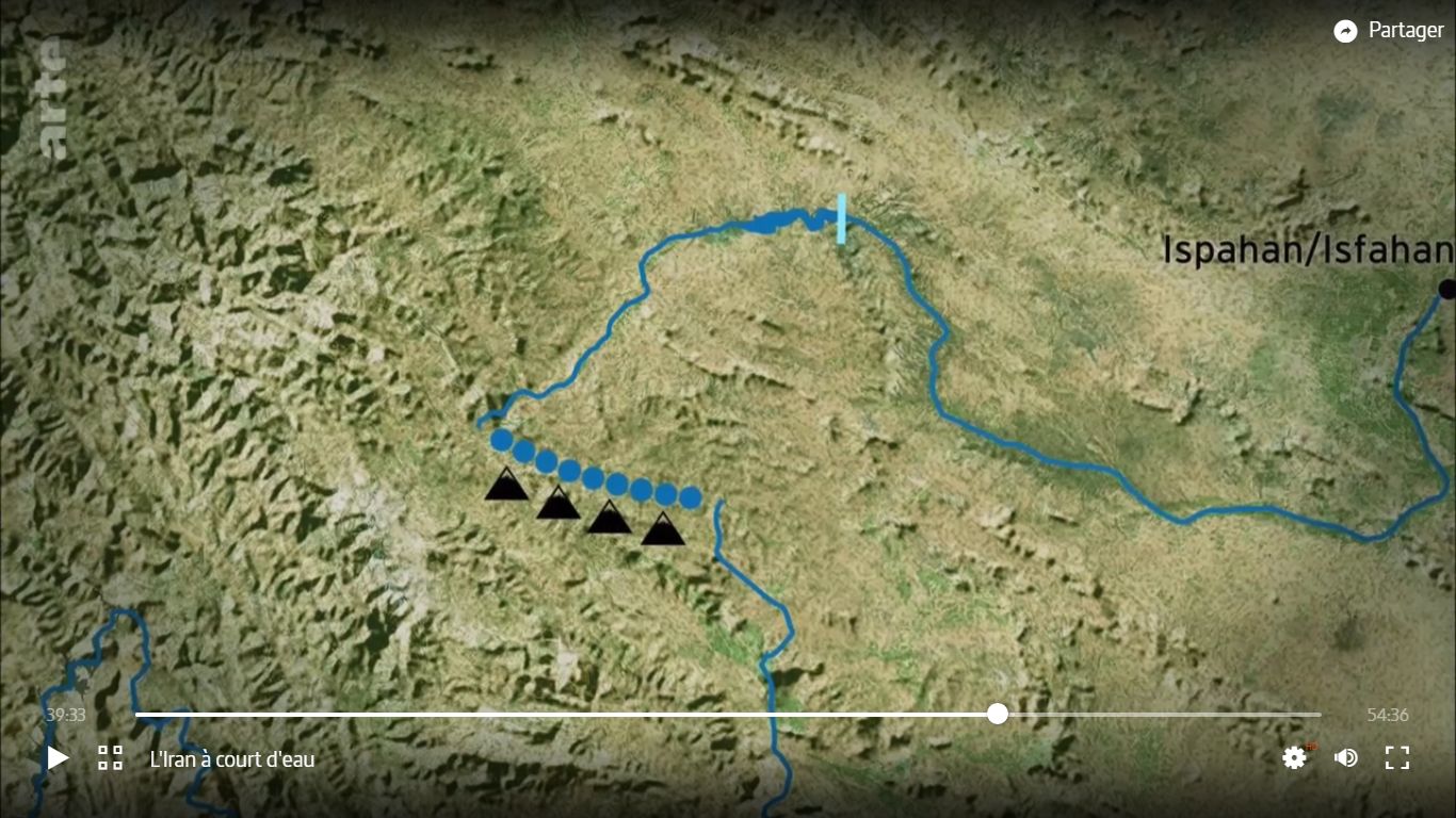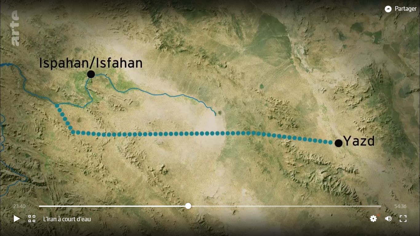 • 30’20 : le détournement d’eau vers Yazd a favorisé le développement de la ville => besoins croissants en eau => manque d’eau => projet d’aller en chercher à 500 km.