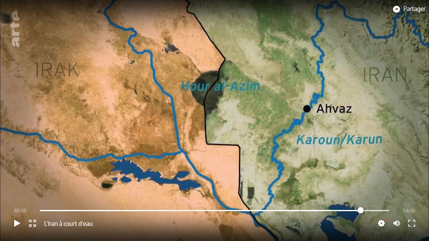 • 50′ : la zone humide de Hour al Azim, à cheval sur l’Irak et l’Iran, a été restaurée par les Iraniens : mais uniquement sur leur partie, ils ont construit une digue pour que leur eau n’aille pas sur la partie irakienne, qui reste donc (partiellement) asséchée…