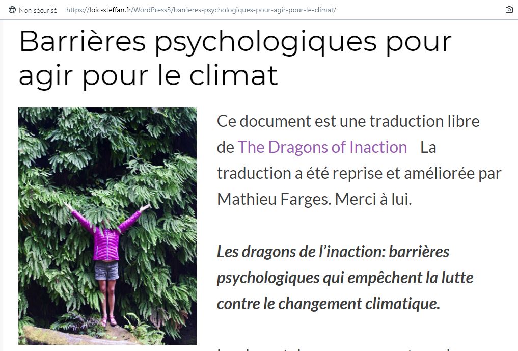 Aux côtés de Pablo Servigne et Cyril Dion, il faut donc ajouter Loïc Steffan en troisième larron. Son blog a au moins le mérite d’annoncer clairement sa couleur moralisatrice : porter un « Regard éthique, économique et social sur l’actualité », mais ce qu’on y trouve laisse pantois. Par exemple cet article2 au titre bizarre : « Barrières psychologiques pour agir pour le climat », où l’on apprend que les individus :