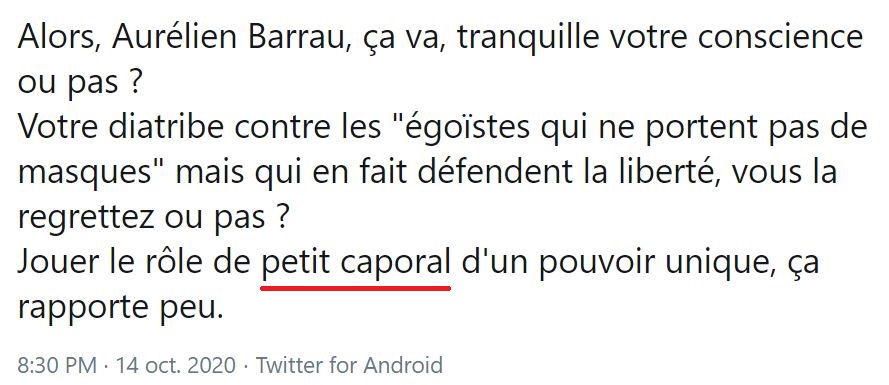 Avec ces termes lourds de mépris publiés sur Facebook, (donc à la face du peuple), Aurélien Barrau s’abaisse au niveau de ceux qu’il fustige. Est-ce le rôle d’un intellectuel de se faire le porte-parole du ministère public ? De colmater les brèches des discours officiels ? De parfaire la logique du système pour « sauver des vies » ? D’en appeler à ce civisme que les élites piétinent sans scrupules depuis des générations ? A en juger par ce tweet, il semble que les « enfants gâtés paranoïaques » répondent non :