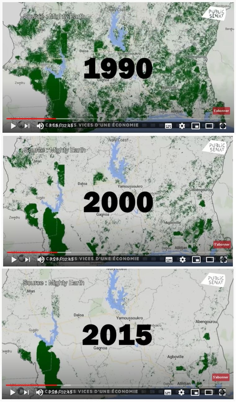 C’est la grande question qui est sur toutes les lèvres et à laquelle ce blog n’en finit pas de chercher des réponses : pourquoi continue-t-on de détruire la planète alors qu’on a bien conscience de foncer dans le mur ? Nous reprenons ce sujet à cause d’un documentaire d’Envoyé Spécial rediffusé fin décembre 2020 sur Public Sénat : « Cacao : les enfants pris au piège ». Ses « images choc » nous ont choqué : elles nous ont fait prendre conscience que nous étions face à un « vrai problème », quelque chose qui dépasse la banale révélation d’un scandale dont le monde regorge, surtout que Public Sénat a eu la bonne idée, dans le débat qui suivait, de montrer la déforestation en trois cartes explicites de la Côte d’Ivoire :